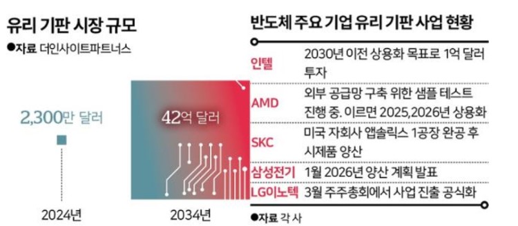 고성능, 저전력 기능을 모두 갖춘 '유리 기판(글라스 기판)'이 산업계의 뜨거운 관심을 받고 있습니다. 인텔부터 삼성전자, SK하이닉스, LG까지 출사표를 던졌습니다. 글로벌 시장조사기관 더인사이트파트너스에 따르면 세계 유리 기판 시장 규모는 올해 2300만 달러(315억원)에서 2034년 42억달러(5조7860억원)로 연평균 5.9% 성장할 것으로 전망됐습니다.