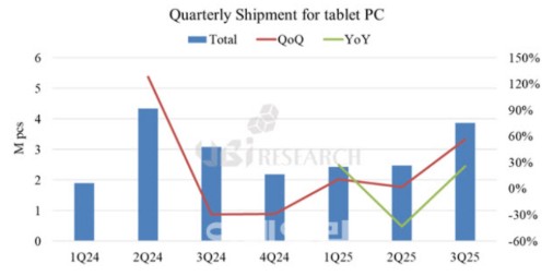유비리서치는 올해 3분기 중대형 OLED 시장은 출하량 기준으로 전분기 대비 11%, 매출 기준으로는 7.2% 증가했다고 밝혔습니다. 지난해 하반기부터 이어졌던 수요 부진 국면을 벗어나면서 중대형 OLED 패널 수요가 점차 회복세로 전화되고 있다고 전했습니다. 중대형 OLED 시장 중에서도 태블릿 PC용 OLED 패널의 출하량이 큰 폭으로 증가했습니다. 3분기 태블릿 PC용 OLED 출하량은 전분기 대비 56%, 전년 동기 대비 25.9% 증가했습니다.