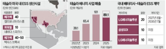 삼성SDI는 최소 3년 동안 매면 10GWh 안팎의 배터리를 테슬라에 공급하기로 했습니다. 연간 1조~1조5000억원에 달하는 규모로 미국 완성차 회사 스텔란티스와 인디애나주에 세운 합작 리튬.인산철 배터리 공장 라인 일부를 ESS용으로 전환해 현지에서 납품할 계획입니다. LG에너지솔루션도 연 10GWh 규모의 ESS용 배터리를 추가 공급하는 방안을 협의 중입니다. 계약이 성사되면 삼성과 LG가 테슬라에 공급하는 ESS 배터리 물량은 연 40GWh로 확대됩니다. 금액으로 따지면 연 4조~6조원에 달합니다.